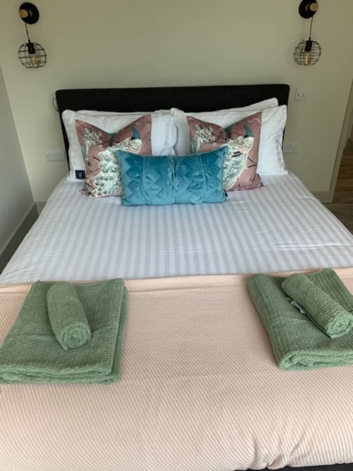 nside is a double bedroom with ensuite bathroom, living area with double sofa bed, kitchen with appliances and dining table, wood burner and TV.